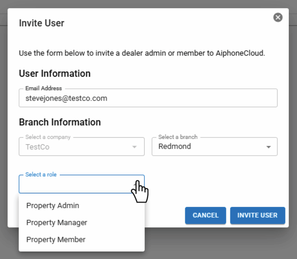 Fill in an email address for the new user, then click Select a Role and select the role to assign them.
