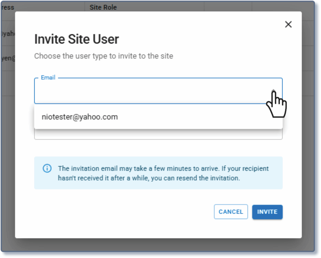 Click Email and select the new user using the drop-down menu. If their email does not appear, they have not completed the registration process yet.