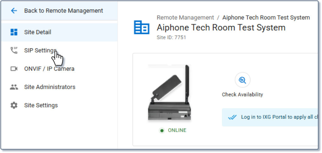 Log into AiphoneCloud, navigate to Remote Management, and select the appropriate site. From the home screen, select SIP Settings.