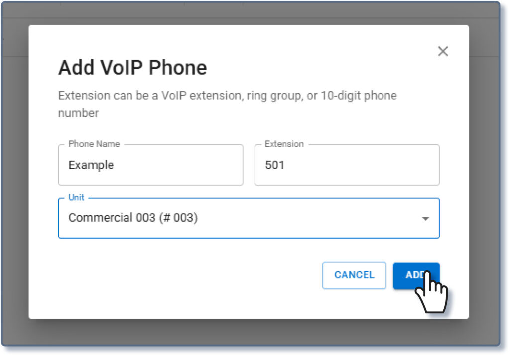 Fill in the Phone Name and Extension, then use the drop-down menu to assign the extension to an existing unit, or to automatically create a new unit to contain it. Click ADD. Repeat these steps as needed for additional extensions. Note: A station can only call one extension at a time. If multiple extensions need to be called at once, configure a call or hunt group in the IP PBX, and enter that shared extension on this page instead.