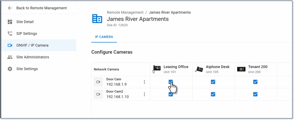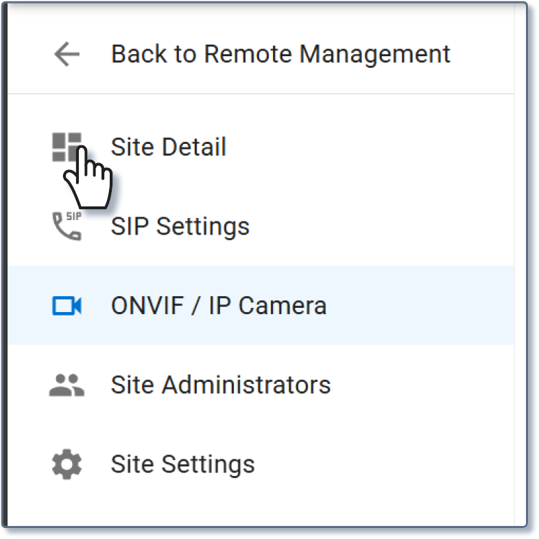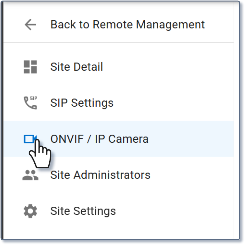 Once the key has been found, navigate to the site in Remote Management. On the left menu of the site’s main screen, select ONVIF / IP Camera.