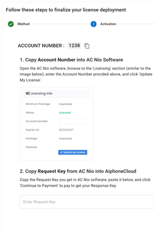 Click Continue to Payment in the bottom right corner of the screen. Complete the payment process, either by using a payment method or entering a license key. This will generate a Response Key. Navigate back to the AC Nio software and paste it, then click Update My License.