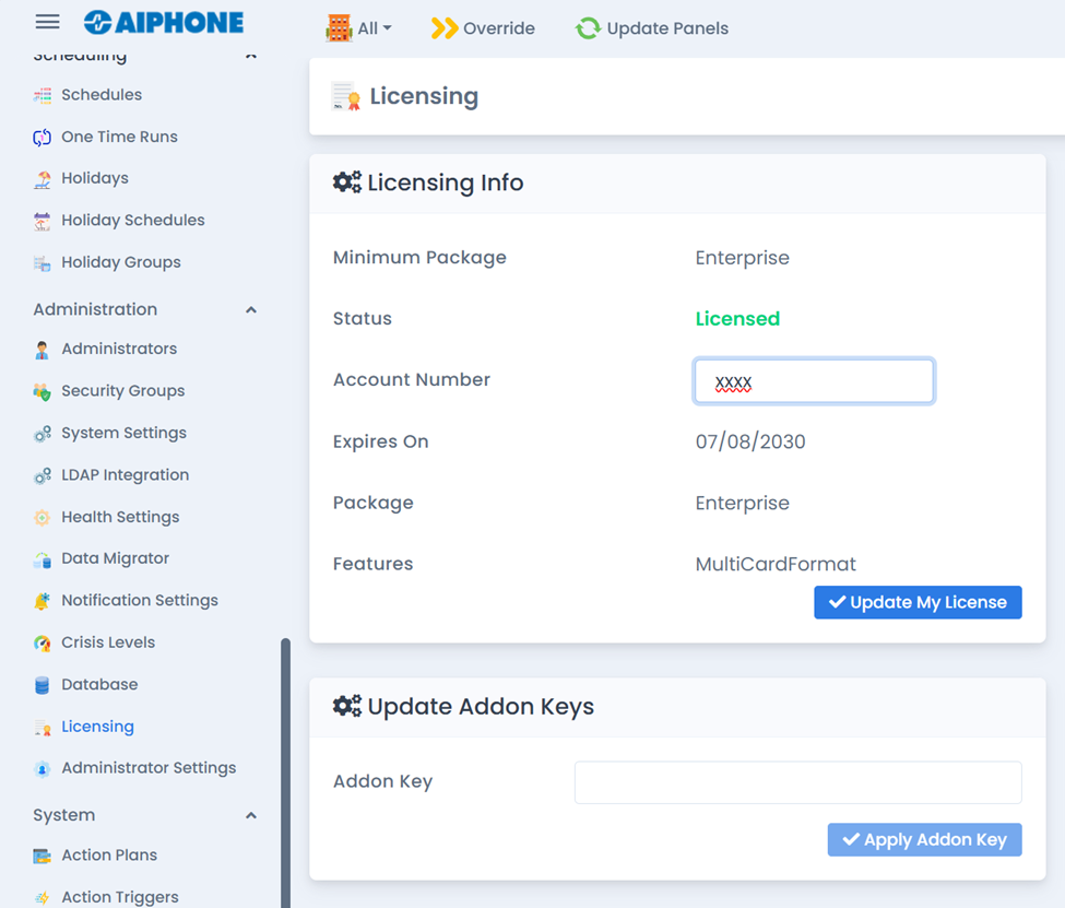 Navigate back to AC Nio, though leave AiphoneCloud open in another window. In AC Nio, navigate to Administration, Licensing on the side menu. Enter the account number from AiphoneCloud and click Update My License.