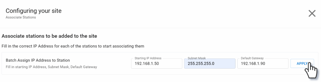 To assign via batch, enter the first IP address and subnet mask in the range, then click Apply.