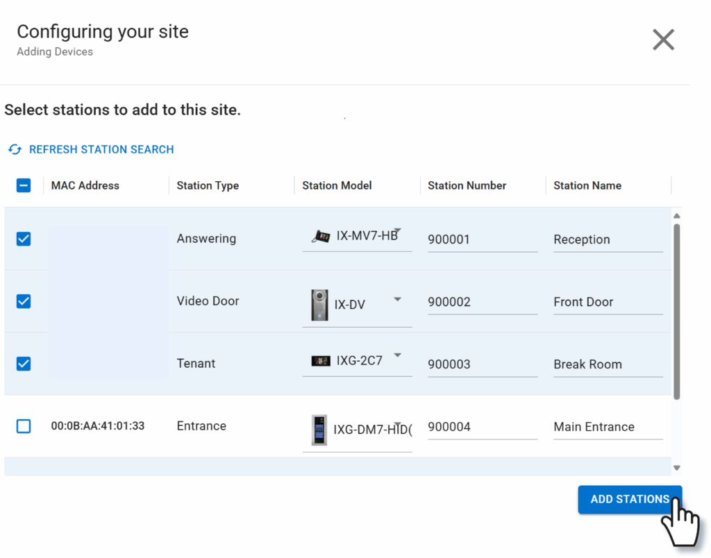 If no stations show up on the new Configuring your site pop-up, click Refresh Station Search. Otherwise, check the found stations that will be added to the site and clickAdd Stations.